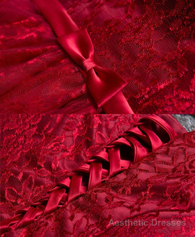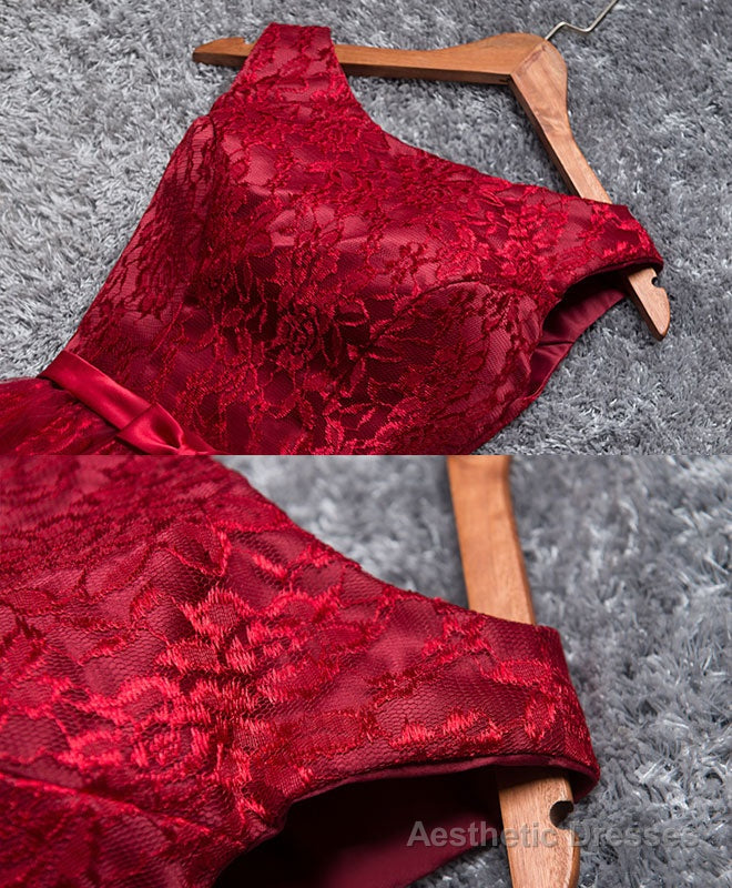 Burgundy A Line Lace Short Prom Dress, Burgundy Evening Dress