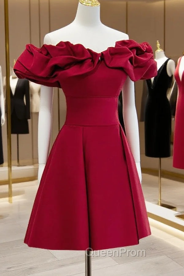 Burgundy A-Line Off Shoulder Satin Short Evening Prom Dresses, Burgundy Homecoming Dresses
