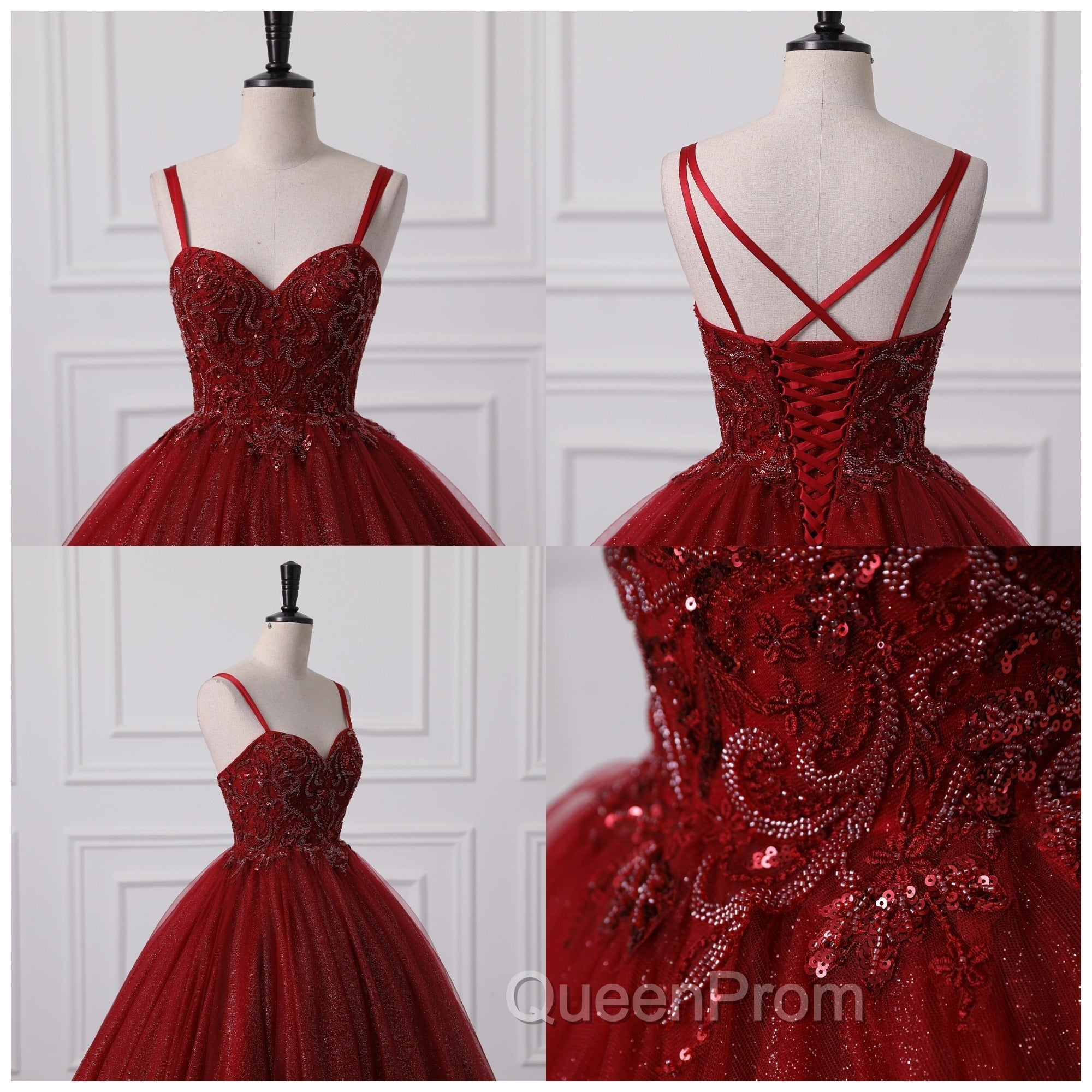 Burgundy Bling Tulle Ball gowns Long Evening Prom Dresses with Embroidered Sequins