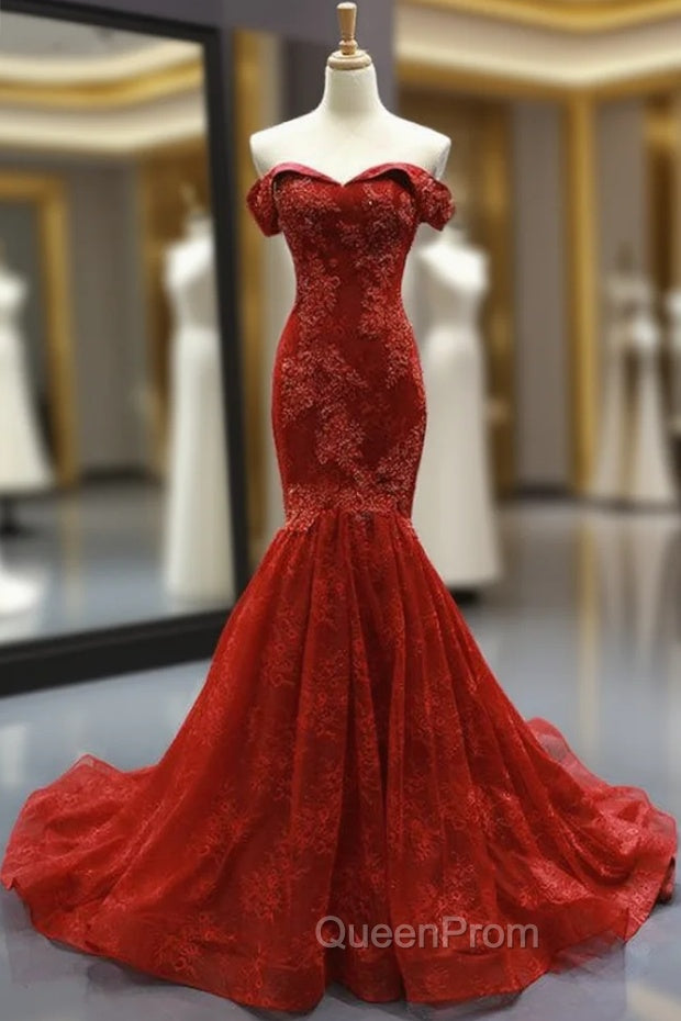 Burgundy Lace Mermaid Off The Shoulder Evening Prom Dresses With Beading