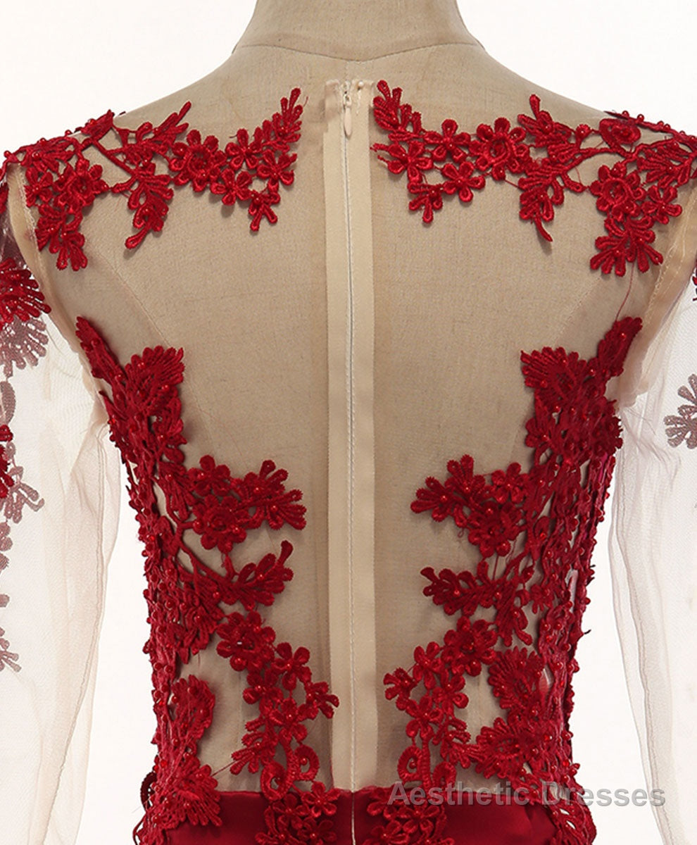 Burgundy Round Neck Lace Satin Mermaid Long Prom Dress Lace Formal Dress
