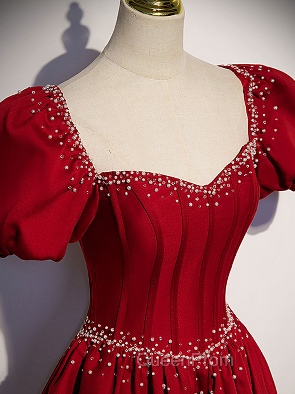 Burgundy Satin Beads Long Evening Prom Dresses, Burgundy Long Evening Dresses