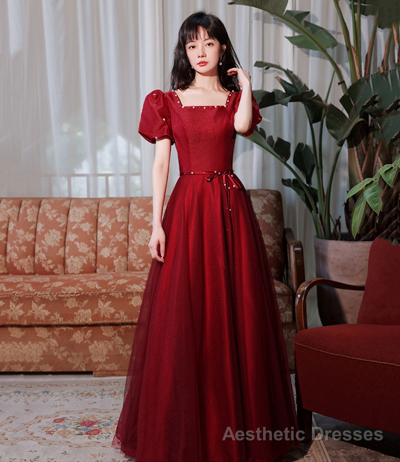 Burgundy satin tulle long prom dress A line evenig dress