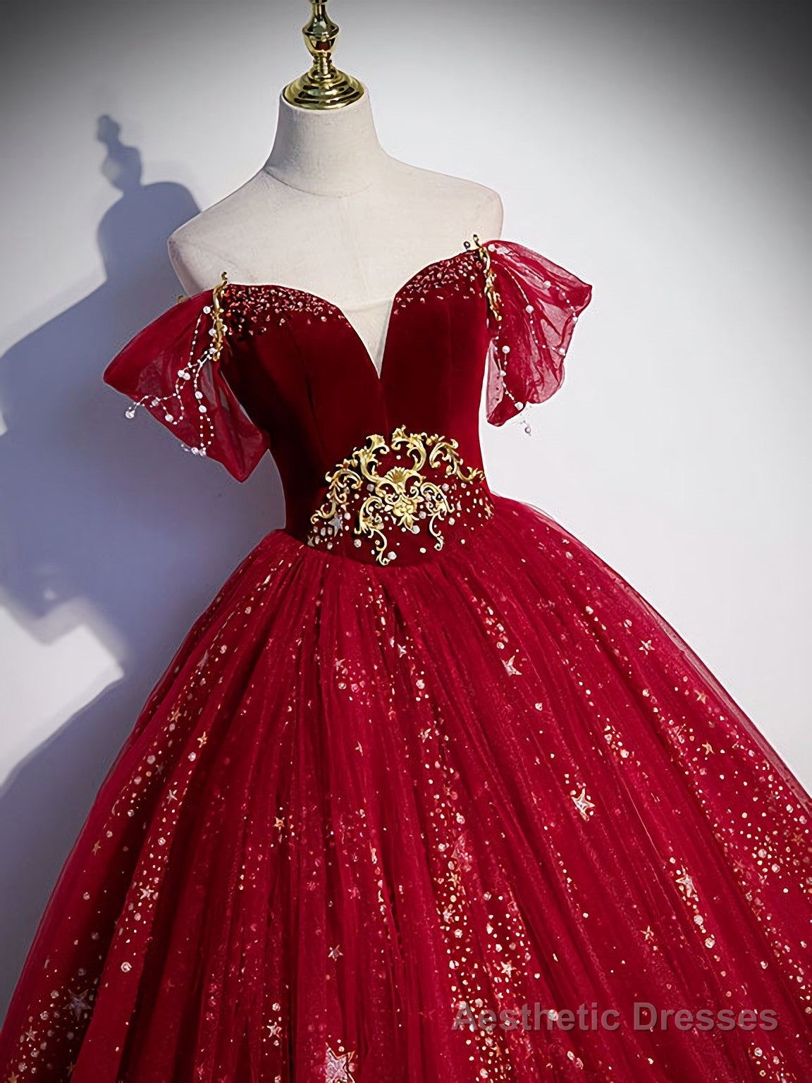 Burgundy Tulle Sequin Long Prom Dress, Burgundy Tulle Formal Dress