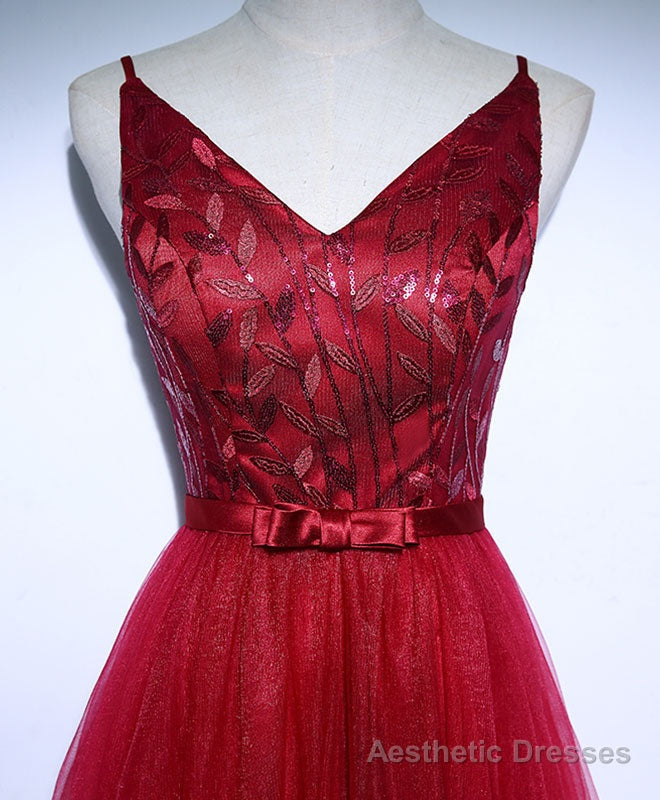 Burgundy V Neck Tulle Long Prom Dress, Evening Dress
