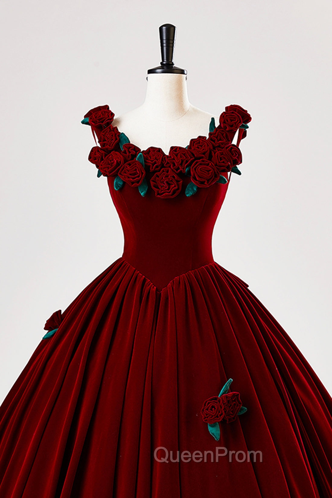 Burgundy Velvet Floor Length Evening Prom Dresses, A-Line Evening Party Dresses With Flowers