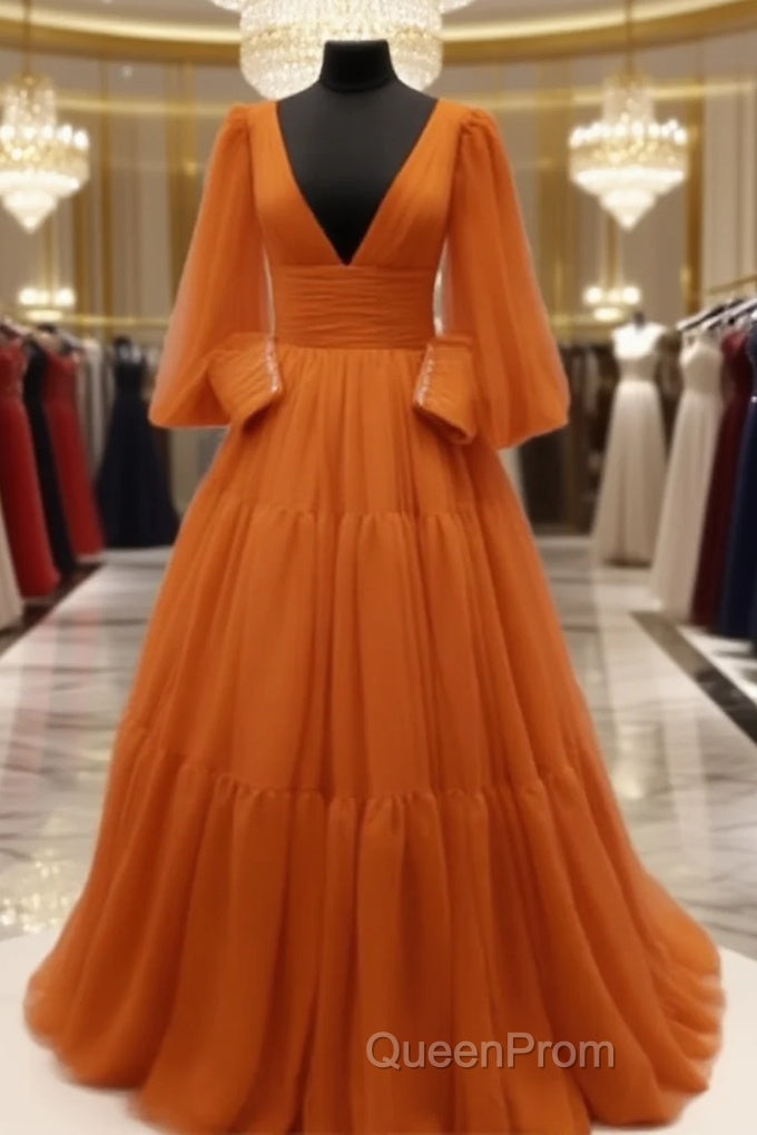 Burnt Orange Tulle V-Neck Ball Gown Dresses