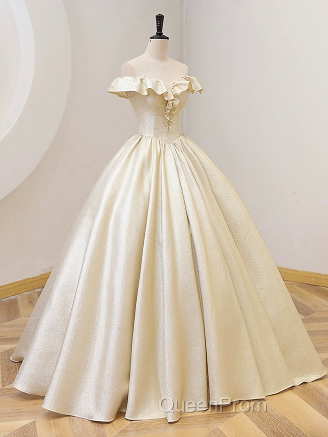 Champagne Off The Shoulder Floor Length Evening Prom Dresses, Elegant A-Line Evening Party Dresses