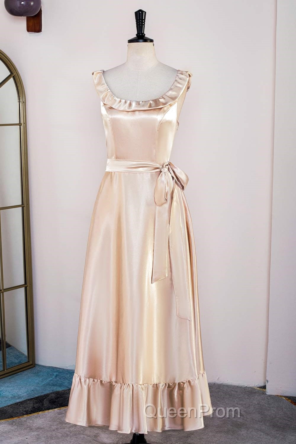 Champagne Sleeveless Ruffled A-line Tea-Length Bridesmaid Dresses with Sash