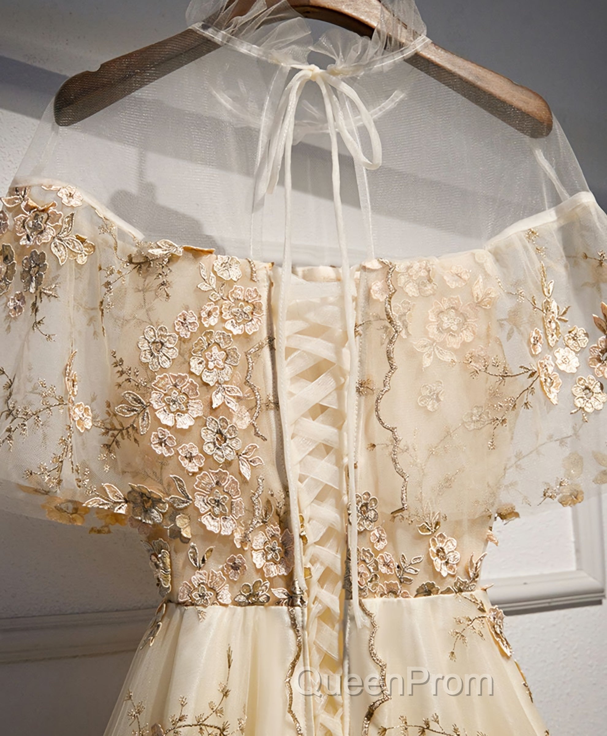 Champagne Tulle Lace Long Evening Prom Dresses, Champagne Formal Dresses, 1