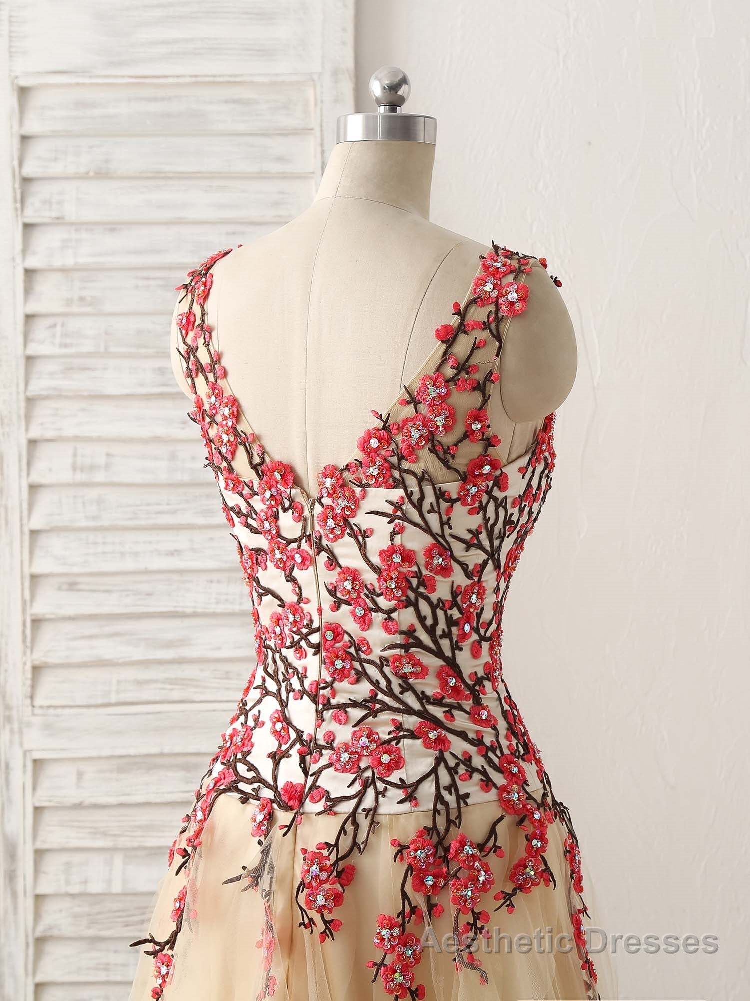 Champagne Tulle Long Prom Dress Lace Applique Evening Dress