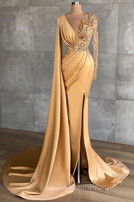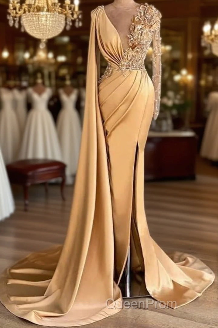 Charming Long Sleeves V-Neck Mermaid Long Evening Dresses With Side Train