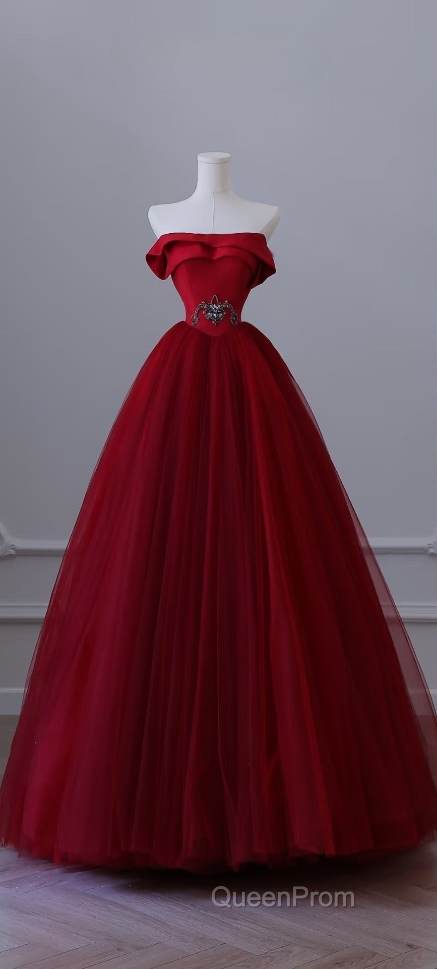 Classy Balll Gown Strapless Red Tulle Long Evening Dresses Evening Prom Dresses
