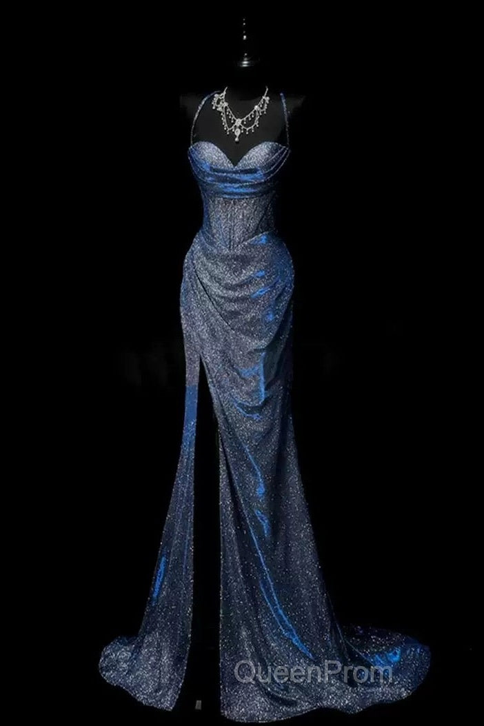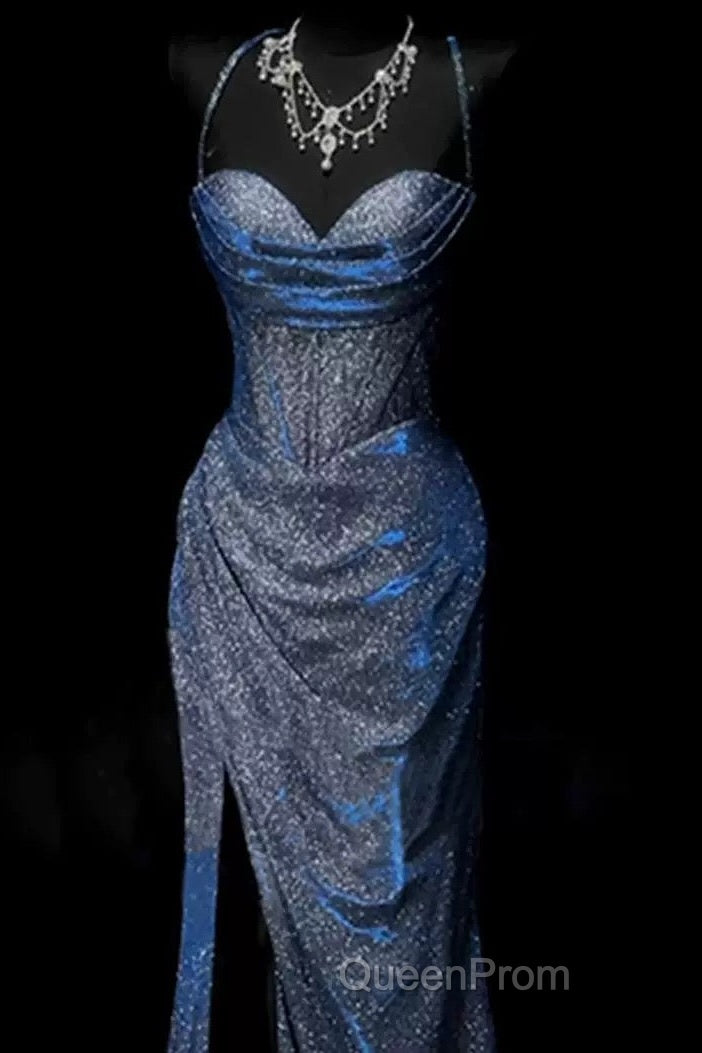Classy Mermaid Spaghetti Straps Navy Blue Sequin Long Evening Gowns Evening Prom Dresses