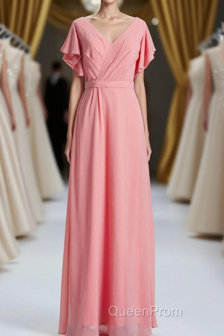 Coral A-line Flutter Sleeves Long Bridesmaid Dresses