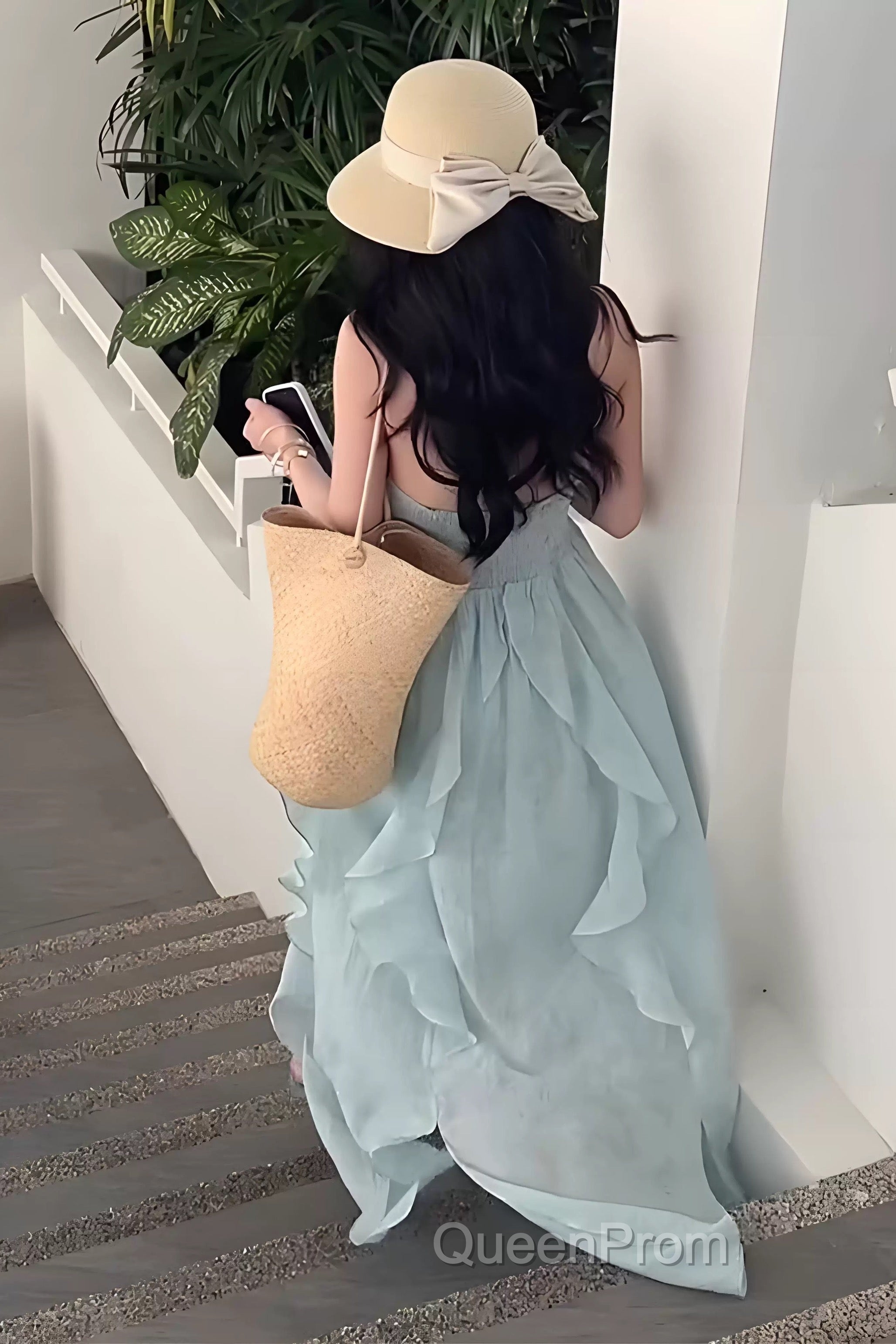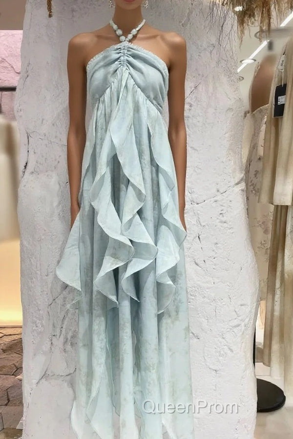 Cute A Line Halter Ruffled Floral Blue Summer Holiday Dresses WomenS Long Vacation Dresses