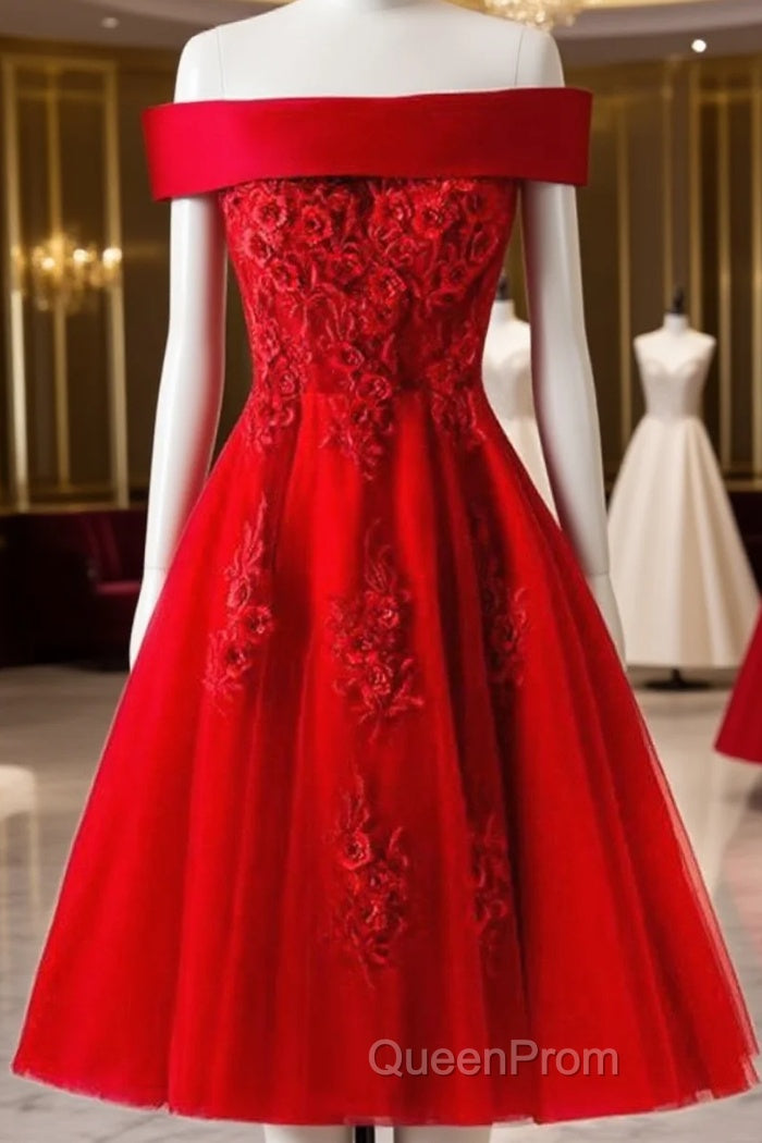 Cute A Line Off Shoulder Short Red Lace Evening Prom Dresses, Short Red Bridesmaid Dresses, Graduation Dresses
