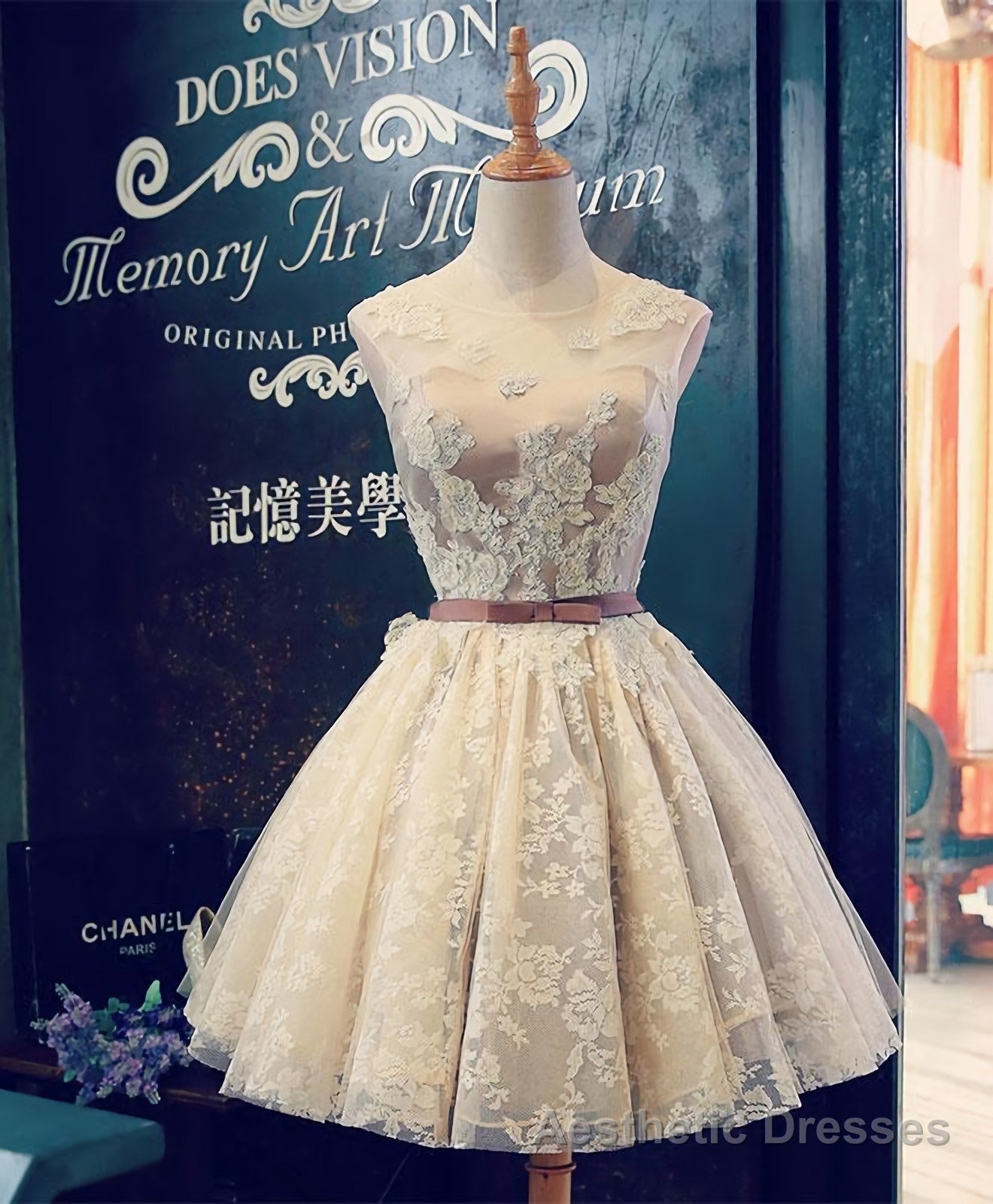 Cute Champagne Lace Short Prom Dress, Cheap Evening Dress