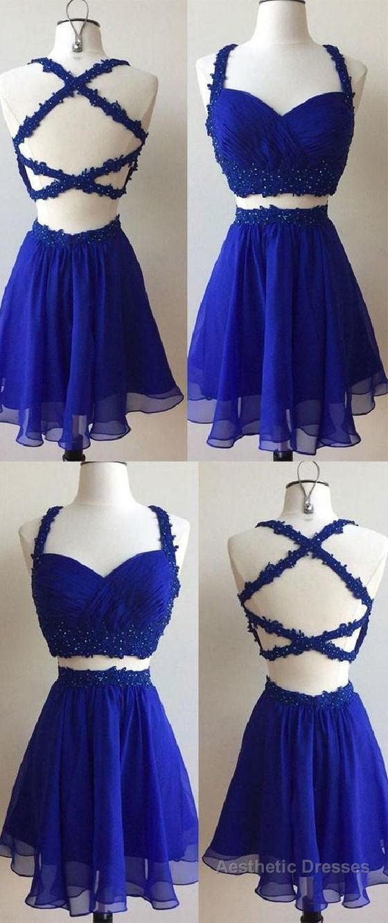 Cute Homecoming Dress, Blue Two Pieces Lace Short Prom Dress, Cute Homecoming Dress