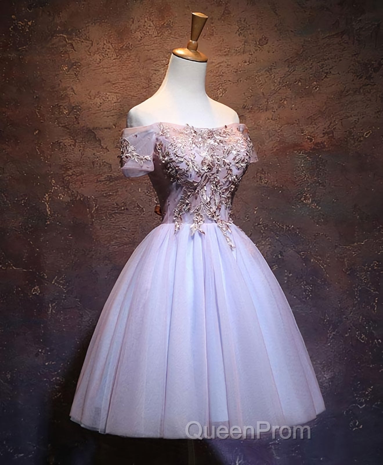 Cute Lace Applique Tulle Short Evening Prom Dresses, Homecoming Dresses