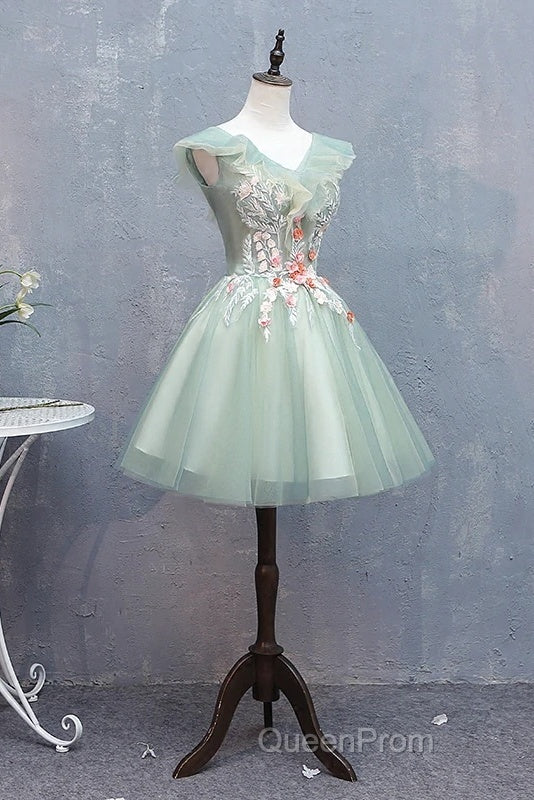 Cute Short Tulle V-Neckline With Flower Lace Party Dresses Homecoming Dresses, Short Formal Dresses