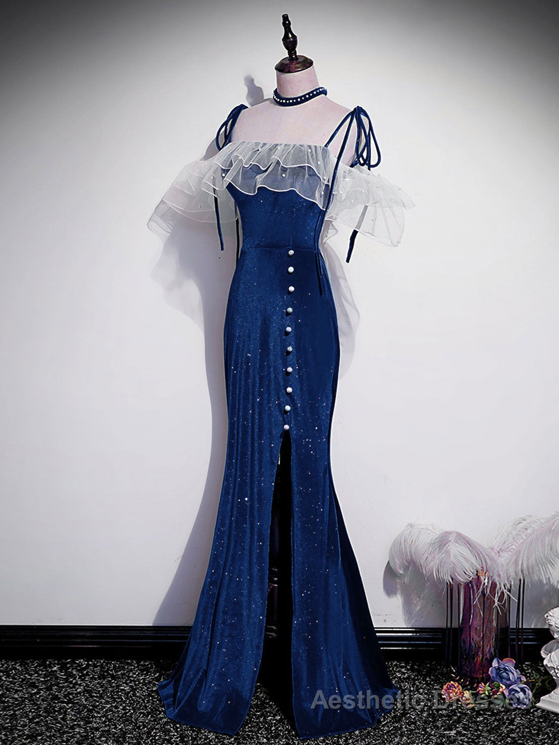 Dark Blue Mermaid Velvet Long Prom Dresses, Blue Formal Evening Dress