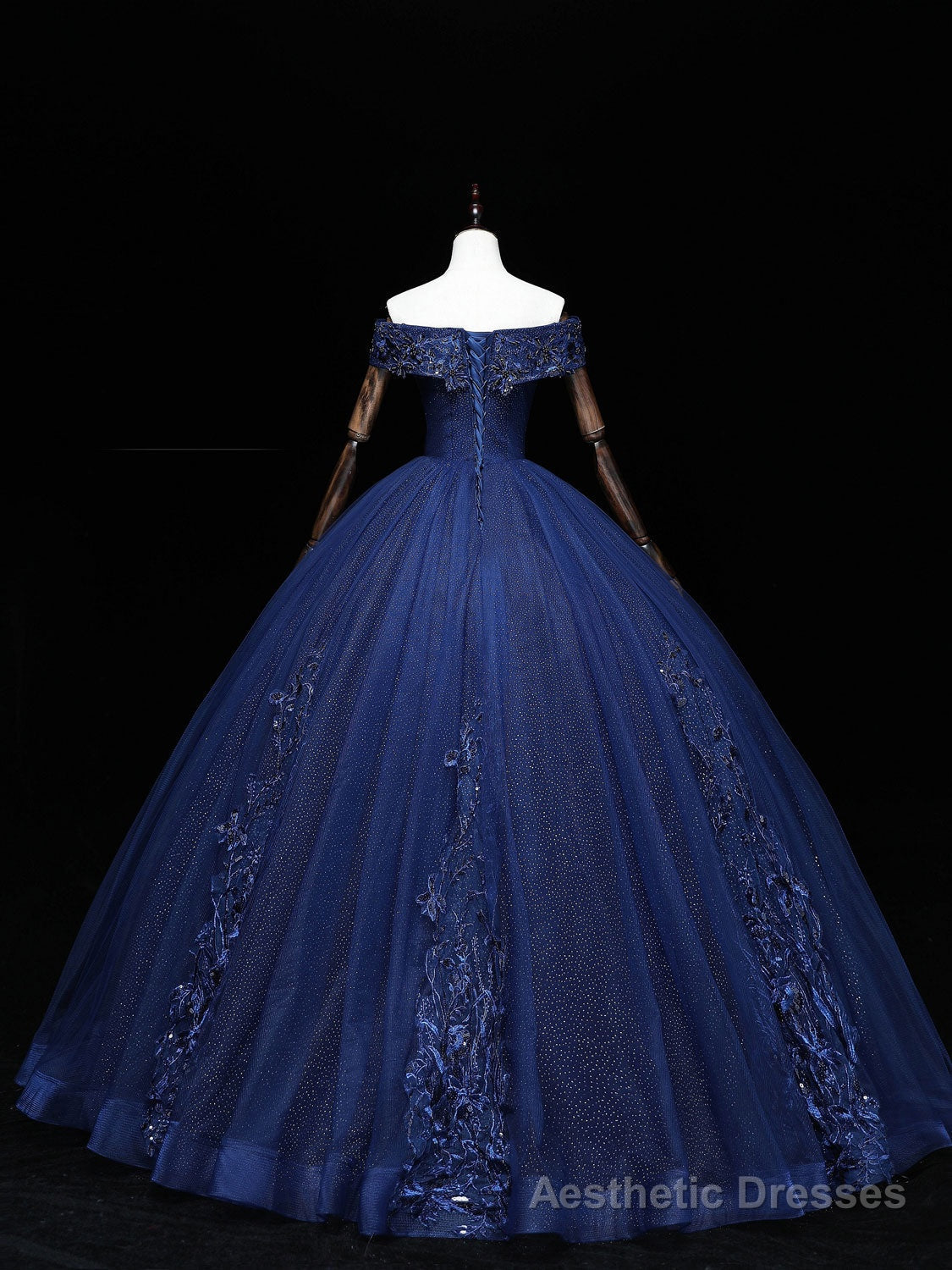 Dark Blue Off Shoulder Tulle Lace Long Prom Gown, Blue Sweet 16 Dress With Beading Sequin