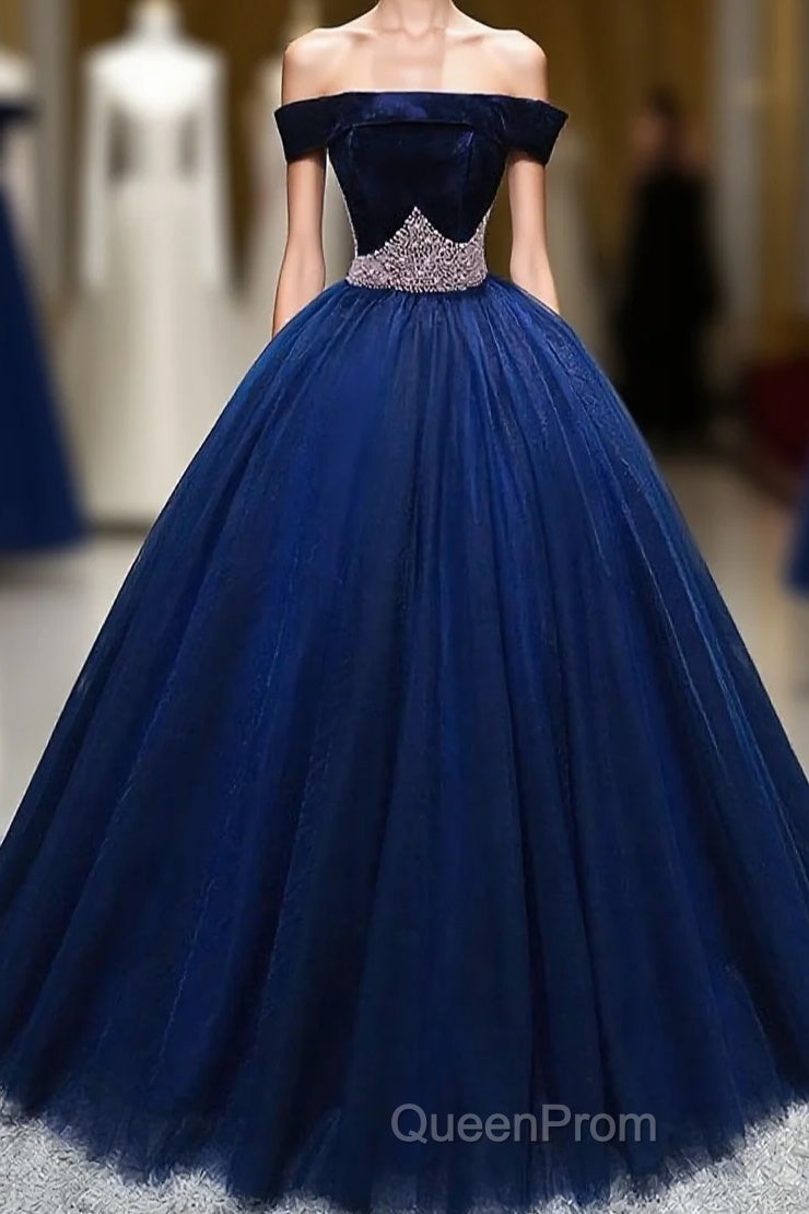 Dark Blue Tulle Off Shoulder Long Evening Prom Dresses, Blue Sweet 16 Dresses