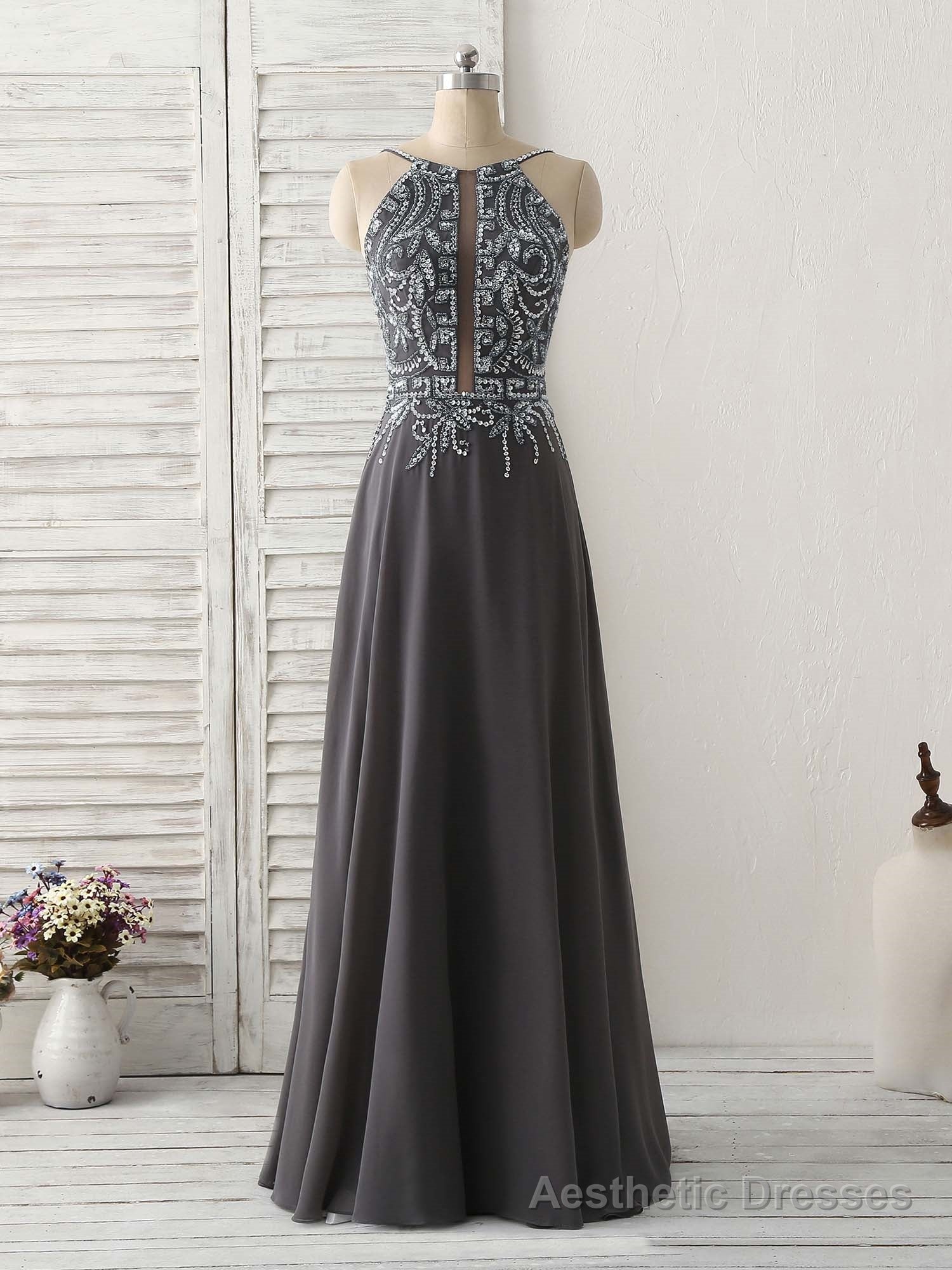 Dark Gray Sequin Beads Long Prom Dress Backless Evening Dress