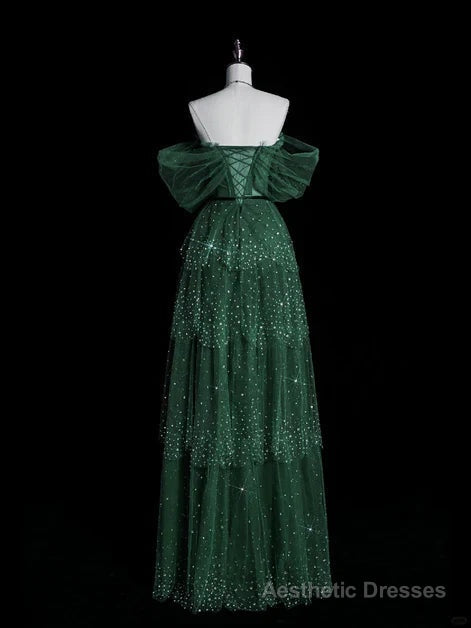 Dark Green A Line Off-the-shoulder Layered Shiny Tulle Prom Dress