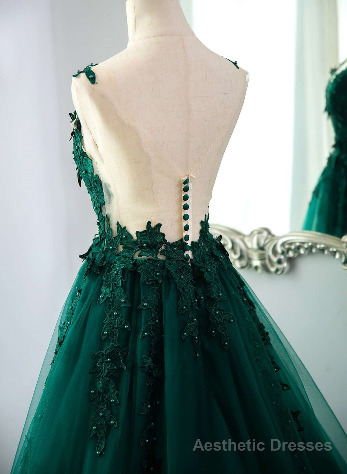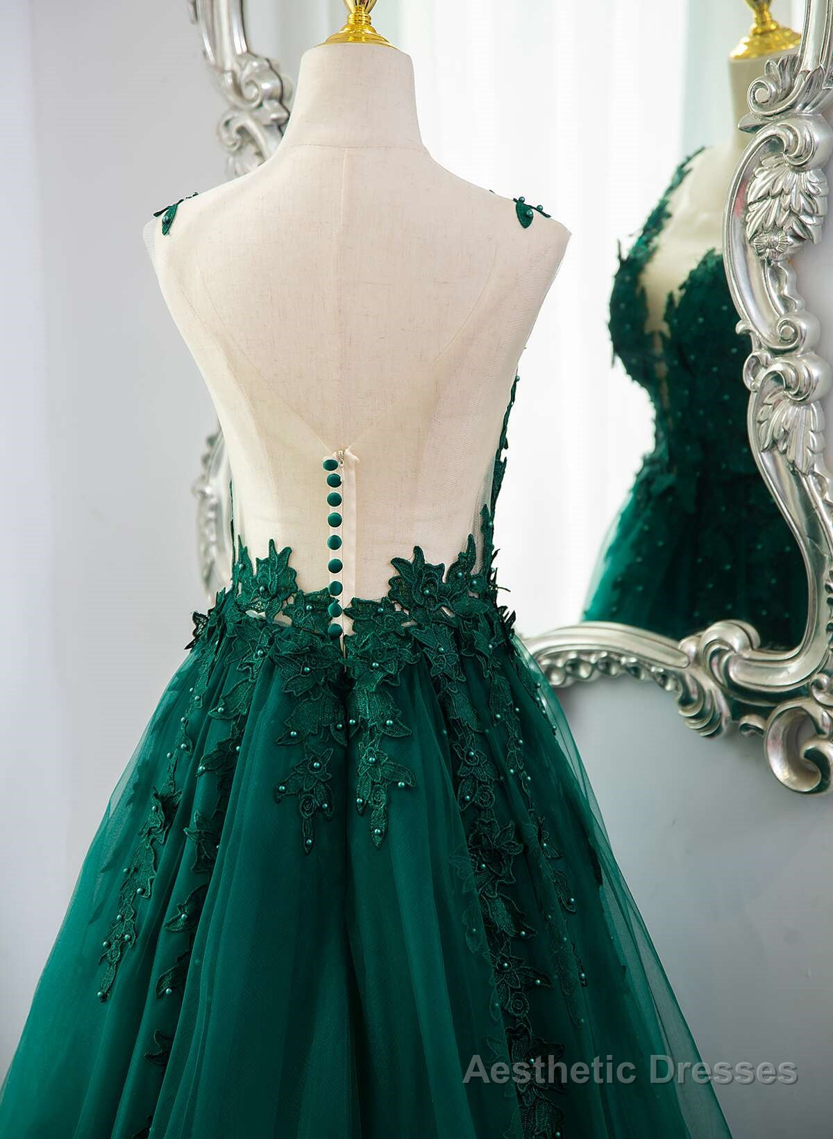 Dark Green V-neckline Lace Long Beaded Prom Dress, Dark Green Party Dress