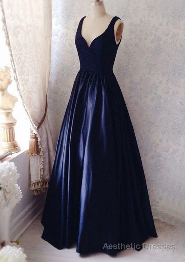 Dark Navy Prom Dresses, A-line/Princess V Neck Sleeveless Long/Floor-Length Satin Prom Dress