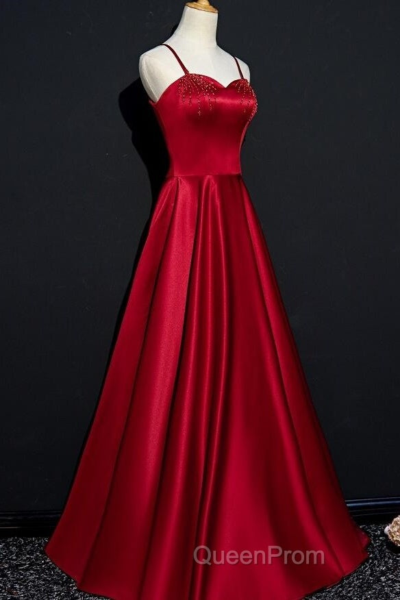 Dark Red Straps Beaded Sweetheart Satin Long Party Dresses, Wine Red Evening Prom Dresses