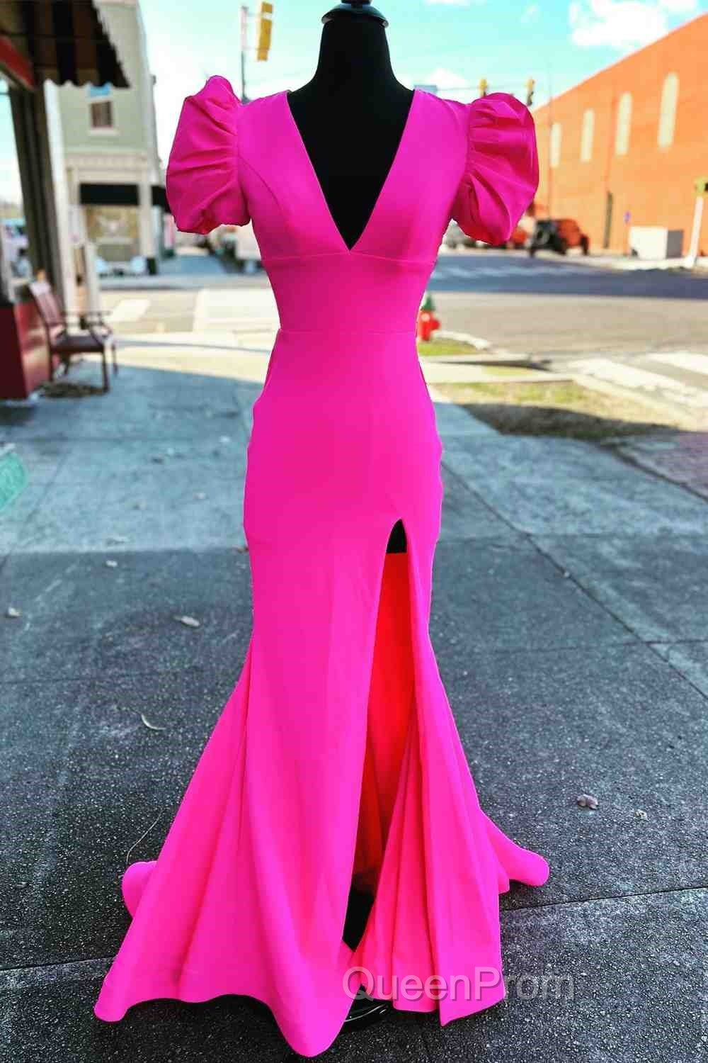 Deep V-Neck Hot Pink Mermaid Long Evening Prom Dresses With Balloon Sleeves
