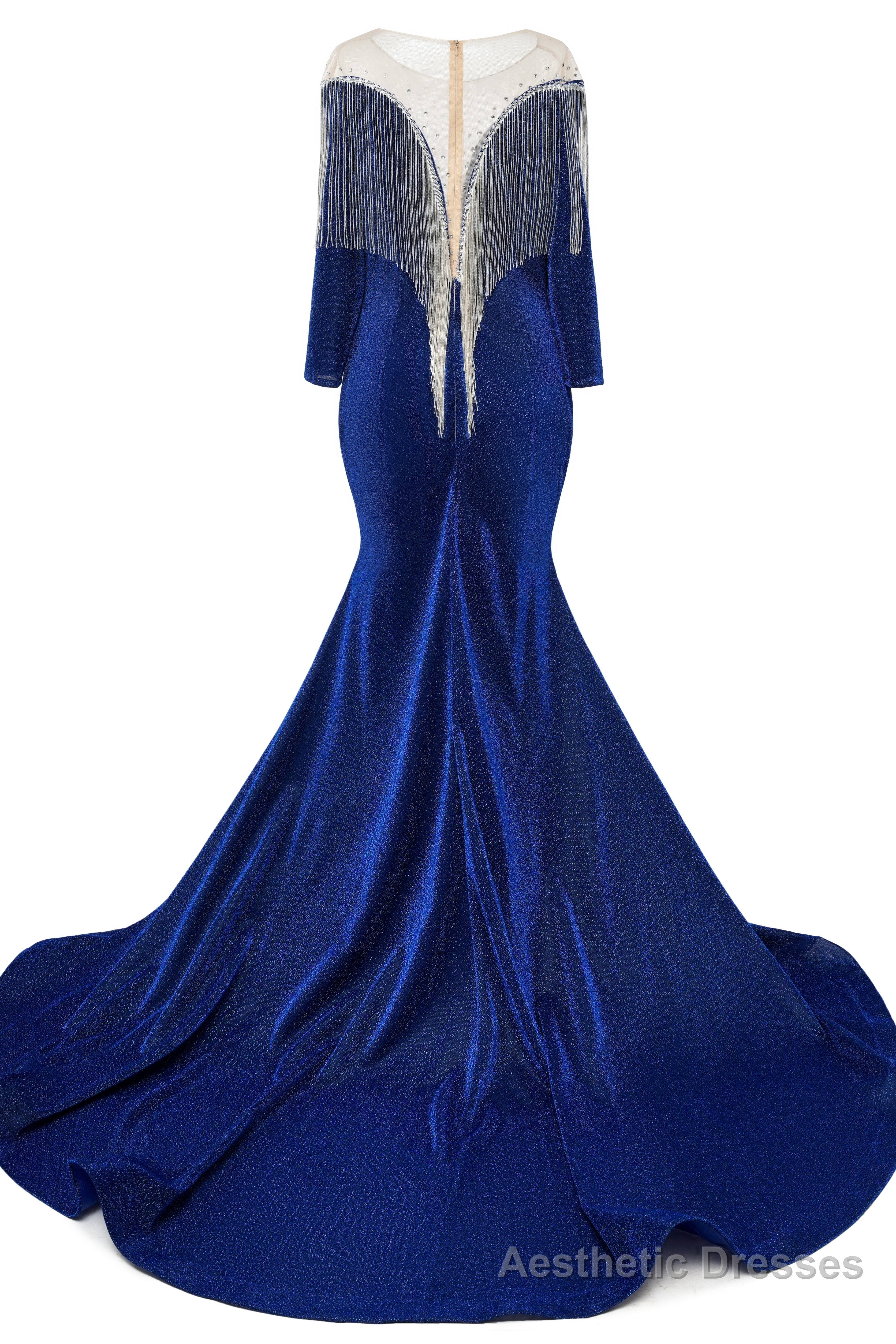 Deep V-neck Shiny Royal Blue Prom Dresses Long sleeves Mermaid Evening Party Dresses