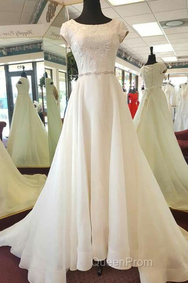Delicate Round Neck Short Sleeves Sweep Train Lace Appliques Wedding Dresses