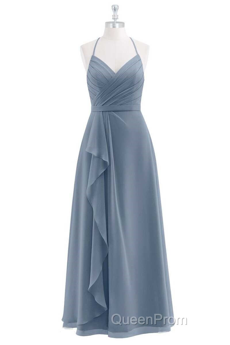 Dusty Blue Chiffon Halter Backless Ruffled Long Bridesmaid Dresses