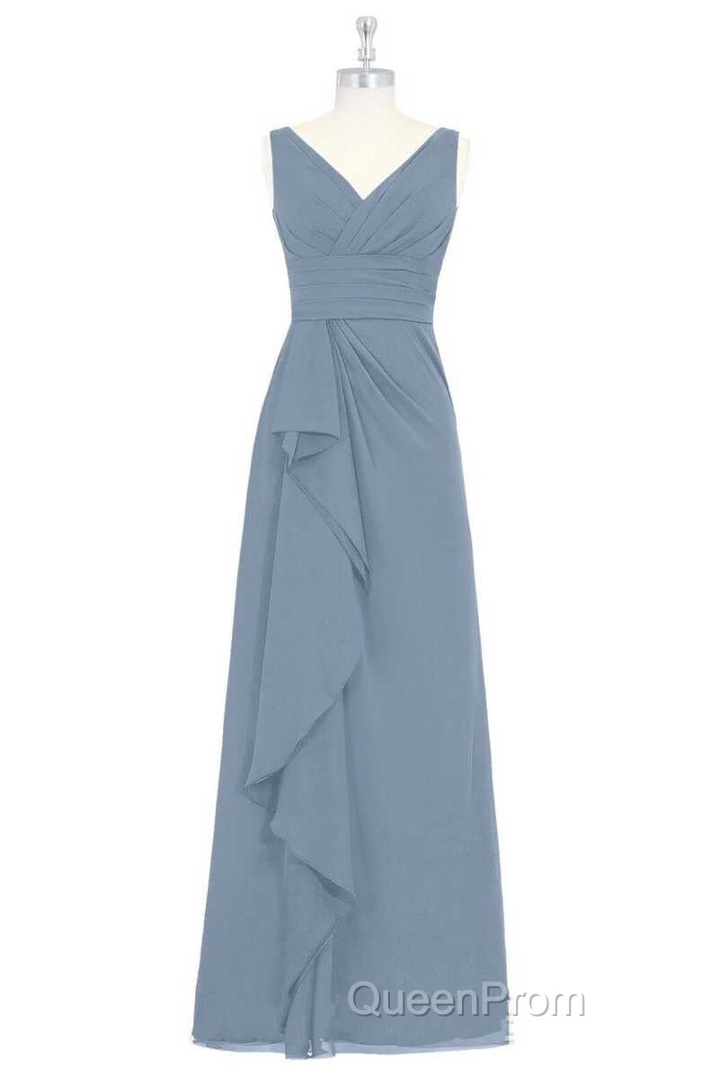 Dusty Blue V-Neck Banded Waist Ruffled Long Bridesmaid Dresses