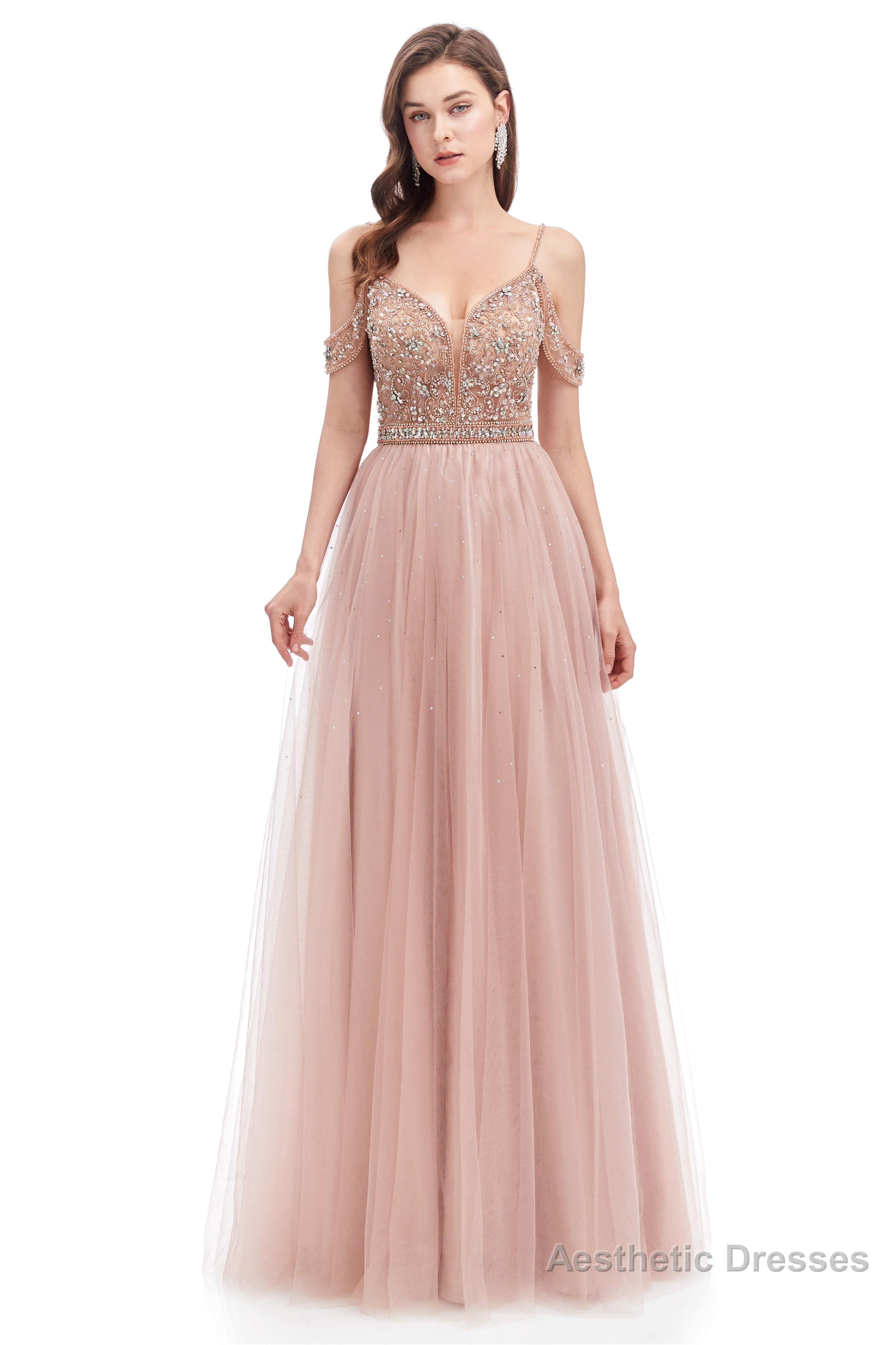 Dusty Pink Crystal Sparkle Starry Prom Dresses with Straps Backless