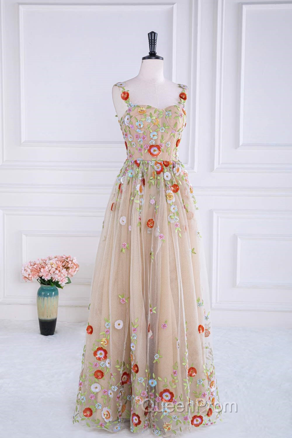 Dusty Pink Sequined Floral Appliques A-line Long Evening Prom Dresses