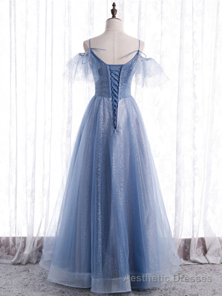 Elegant A line Tulle Sequin Blue Long Prom Dress, Tulle Blue Formal Evening Dress