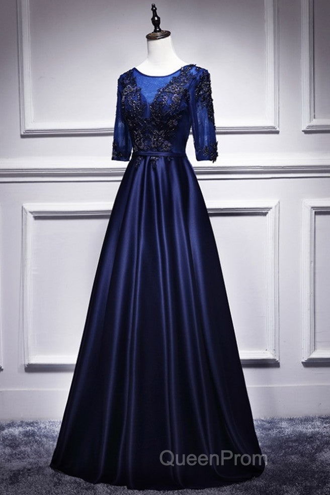 Elegant And Noble Blue Short Sleeved Lace Decal Ball Dresses With Blue V-Neck Satin And Beaded Back Zipper And Floor Length Evening Dresses