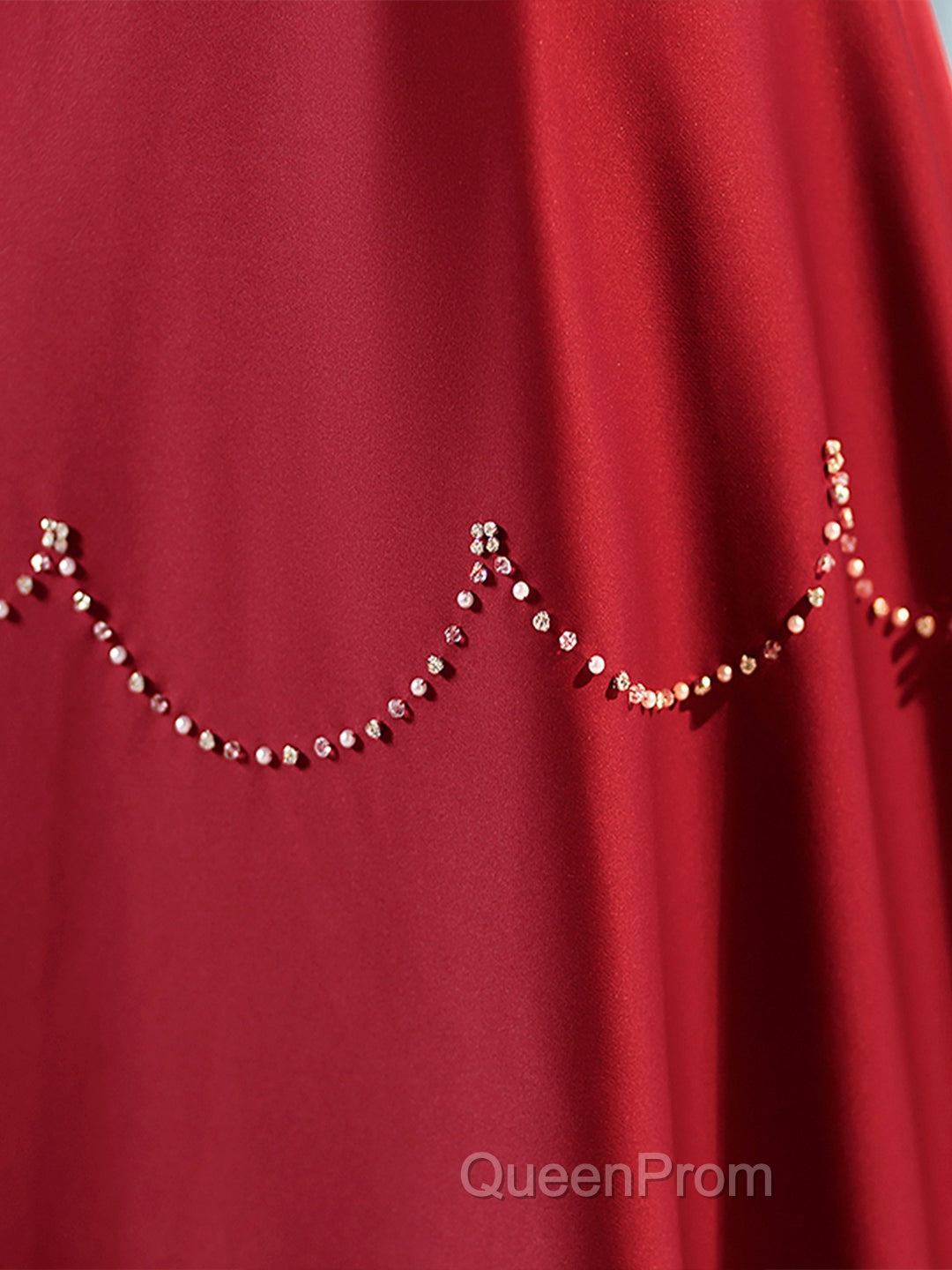 Elegant Burgundy Satin Long Evening Prom Dresses With Beaded, Burgundy Short Sleeve Evening Dresses