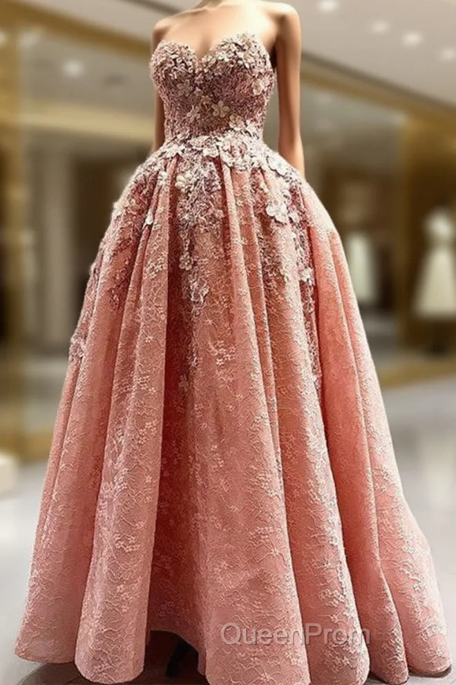 Elegant Handmade Flower Sweetheart Pink Lace Evening Prom Dresses
