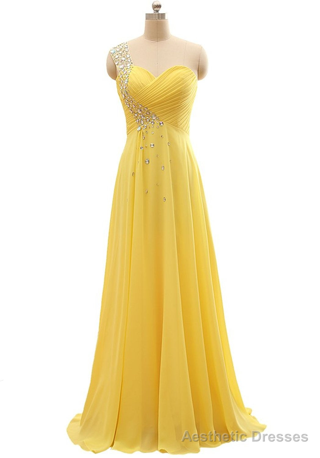 Elegant One Shoulder Yellow Chiffon Beaded Pleat Long Bridesmaid Dresses