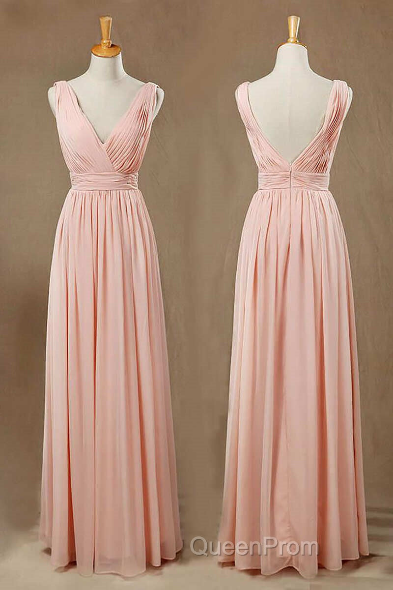 Elegant Plush Pink V-Neck Open Back A-Line Long Bridesmaid Dresses