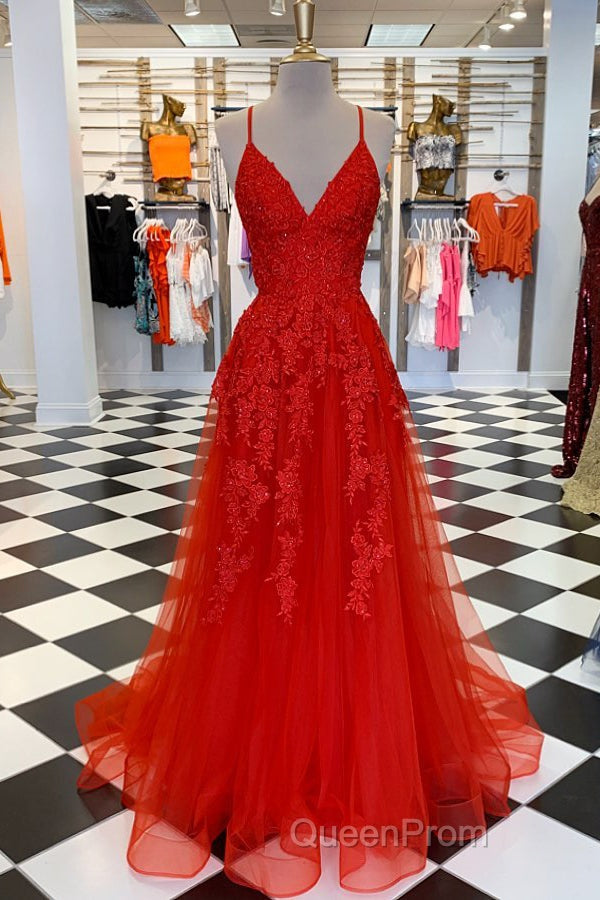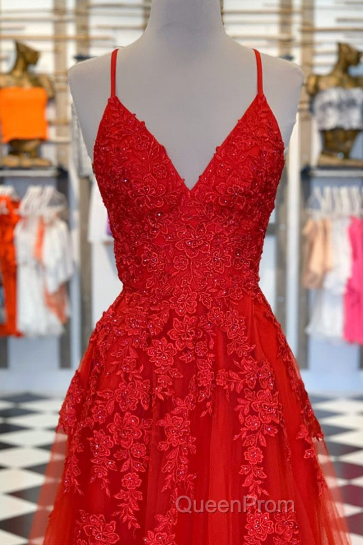 Elegant V Neck A-Line Red Appliqued Long Evening Prom Dresses