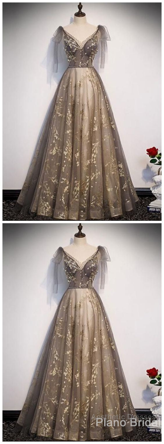 Elegant V Neck Gray Gold Tulle Lace Long Prom Dress, Tulle Formal Dress