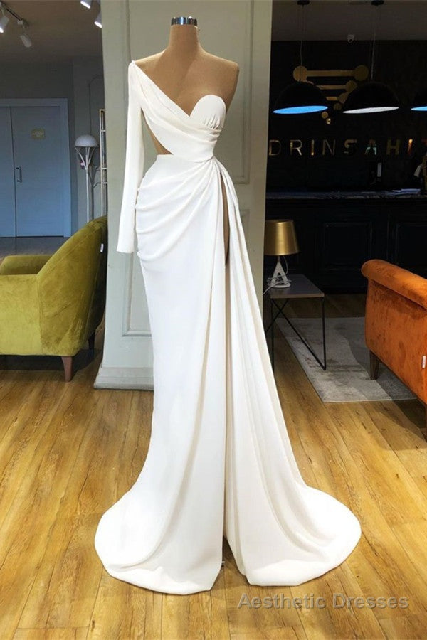 Elegant White Long Sleeve One Shoulder Prom Dress With Split