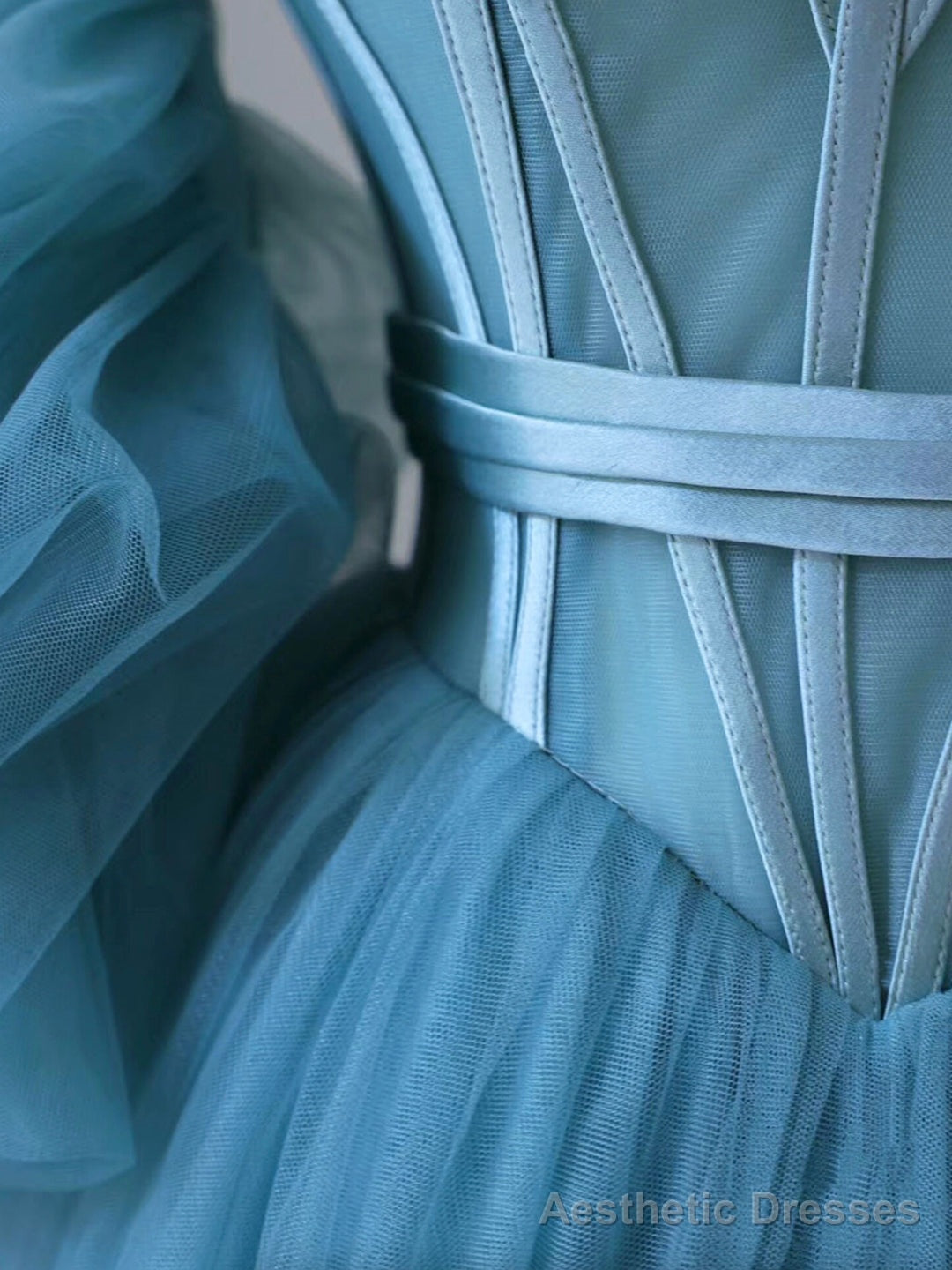 Fairy Blue Spaghetti Straps Corset Tulle Prom Dress, Detachable off Shoulder Party Dress